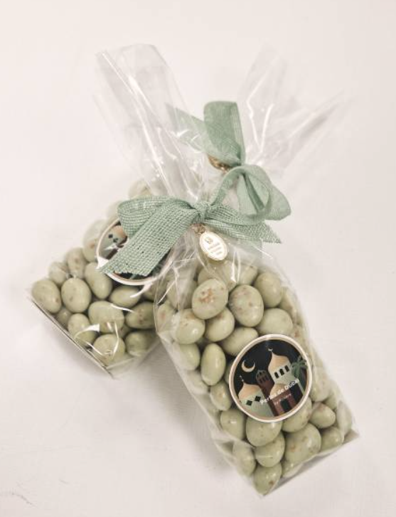 Ces sachets apportent une touche gourmande et luxueuse à votre célébration. Chaque bouchée combine le croquant des crêpes dentelle, la douceur du chocolat blanc et le parfum subtil des pistaches, pour ravir petits et grands.