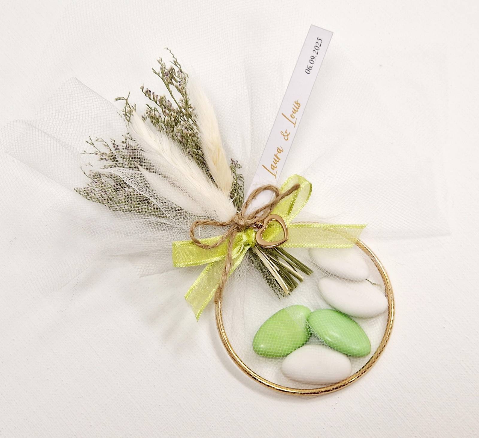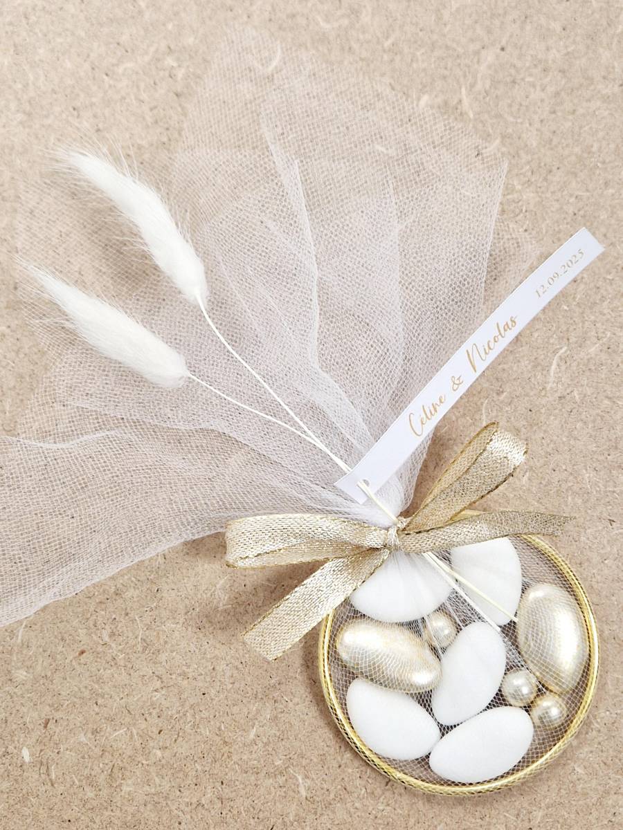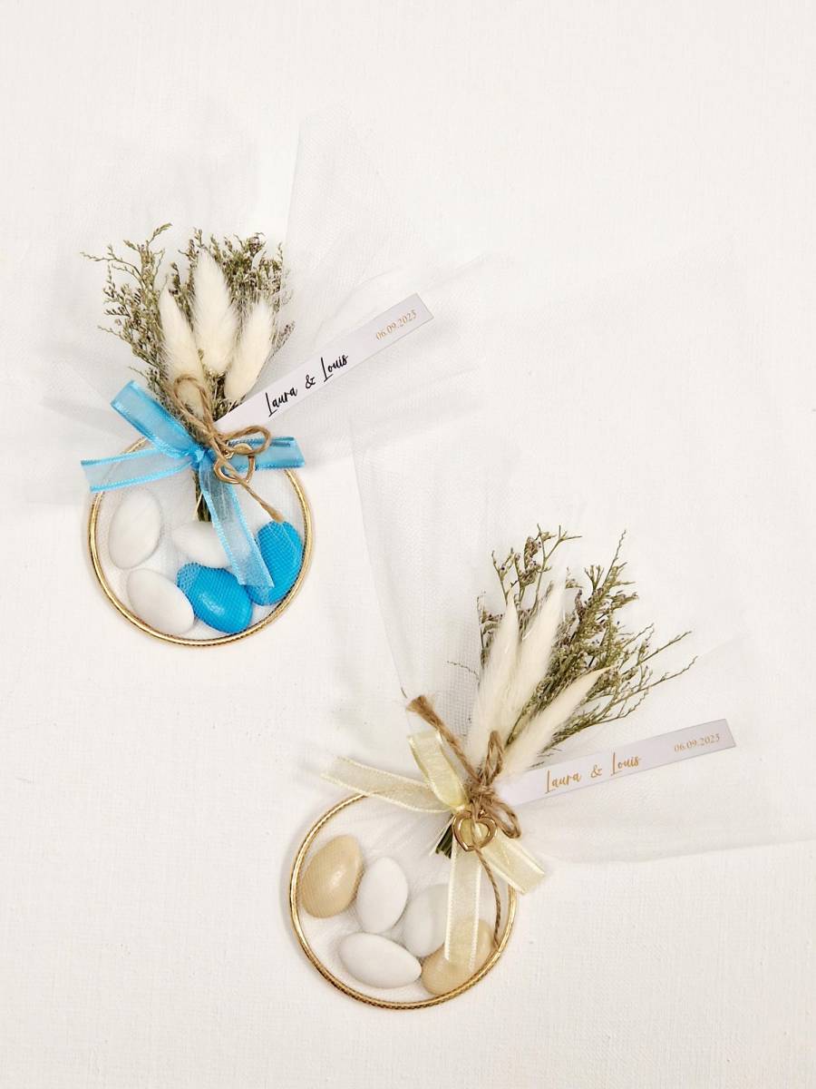 Succombez au charme de l’Anneau de l’Union, un contenant raffiné qui met en valeur vos dragées avec élégance. Composé d’un anneau doré habillé de tulle délicat, orné de fleurs séchées et d’un ruban assorti, il symbolise à la fois l’amour et l’éternité.